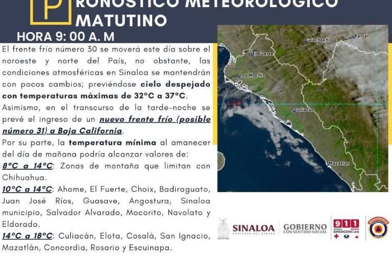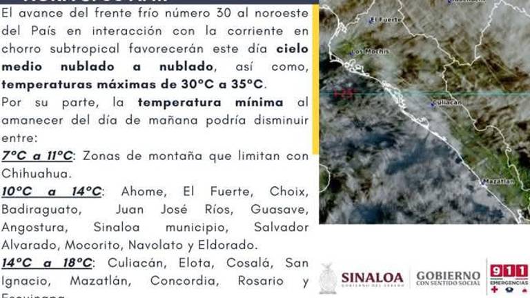 En los municipios de Ahome, El Fuerte, Choix Badiraguato Juan José Ríos, Guasave, Angostura, Sinaloa de Leyva, Salvador Alvarado Mocorito, Navolato y Eldorado alcanzarían de 10 a 14 grados.