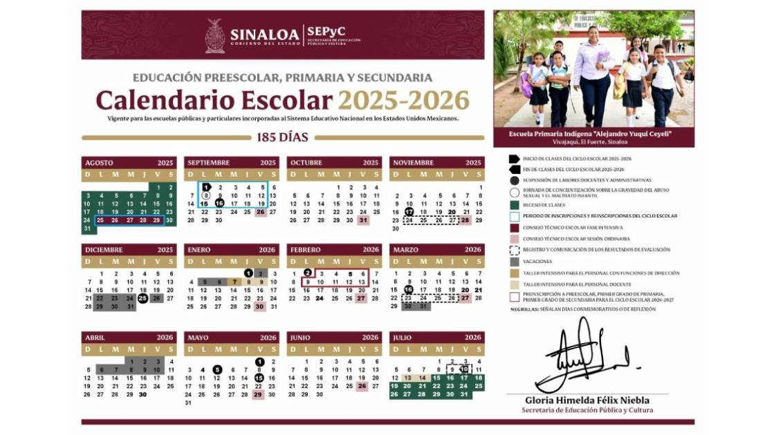 La Secretaría de Educación Pública y Cultura dio a conocer el Calendario Escolar 2025-2026 para las escuelas de educación básica públicas y privadas de Sinaloa, que iniciará el 1 de septiembre de 2025 y finalizará el 10 de julio de 2026, con un total de 185 días efectivos de clases.