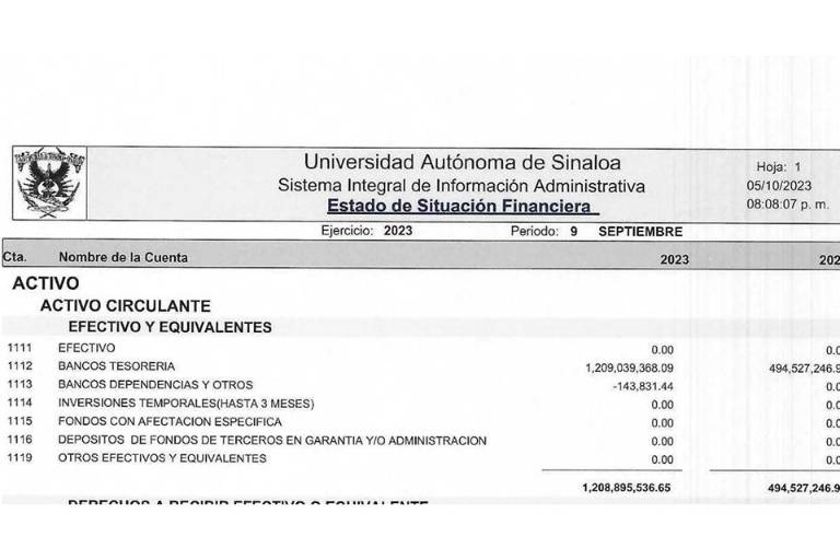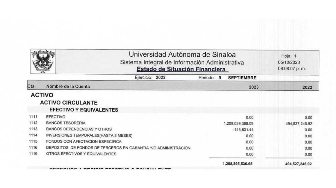 Al cierre del mes de septiembre de 2023, la UAS reportó contar en el rubro de “Bancos Tesorería” con la cantidad de mil 209 millones 39 mil 368 pesos, según consta en el Estado de Situación Financiera del tercer trimestre de la institución y generado por sistema el pasado 5 de octubre.