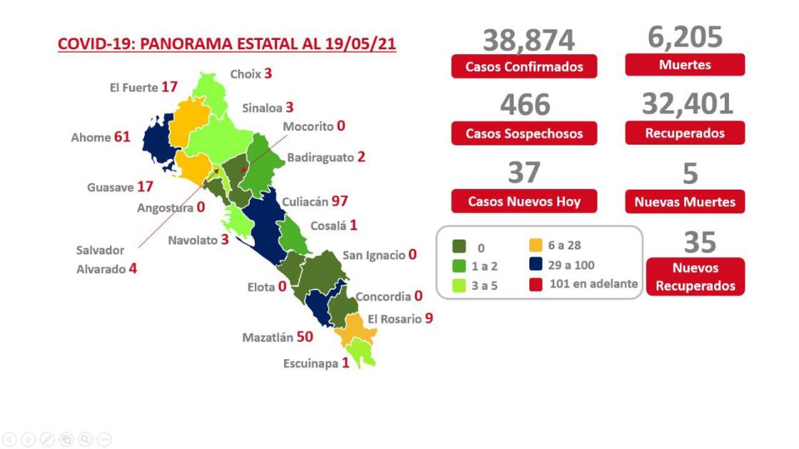 Hoy también se registraron 37 nuevos casos: 20 en Culiacán, 8 en Ahome, 7 en Guasave, y 2 en Salvador Alvarado.