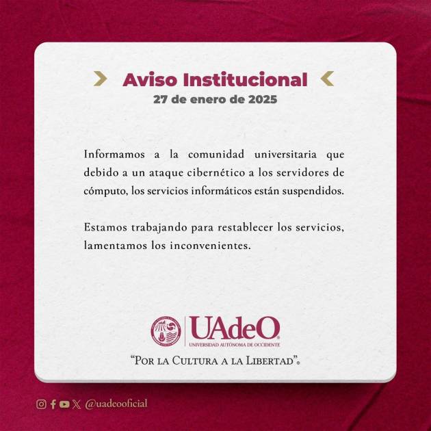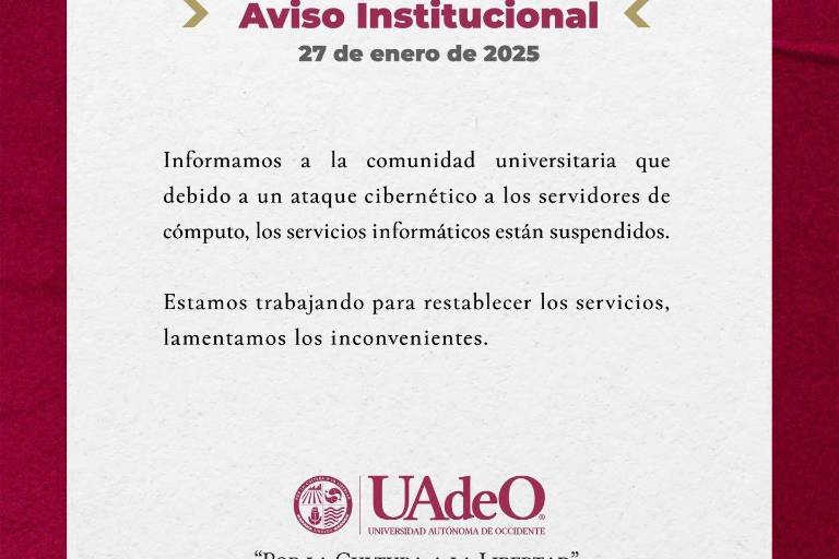 “Informamos a la comunidad universitaria que debido a un ataque cibernético a los servidores de cómputo, los servicios informáticos están suspendidos”, dice el anuncio de la UAdeO.