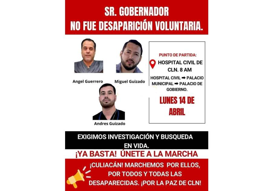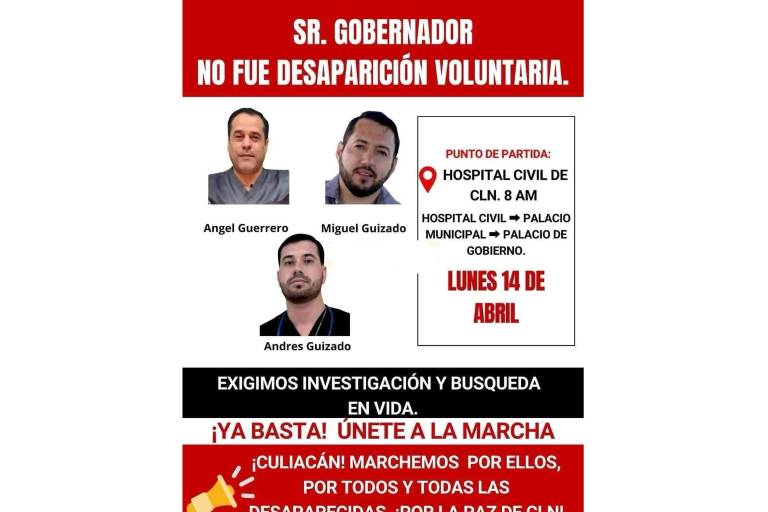 En la lámina que convoca a la ciudadanía a unirse a la manifestación se reclama al Gobernador Rubén Rocha Moya por su declaración en la que opinó esperaba que la desaparición de los trabajadores del Hospital Civil de Culiacán fuese voluntaria.