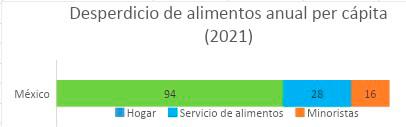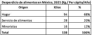En esta categoría destaca la cantidad de alimentos desperdiciados por los usuarios finales, ya que se estima que en México se pierden 138 kilos de alimentos por persona al año, de los cuales 94 kilos (68% del total) se desperdicia en casa, 28 kilos (20%) a través de los servicios de alimentos como los restaurantes y 16 kilos (11.5%) en los comerciante minoristas.