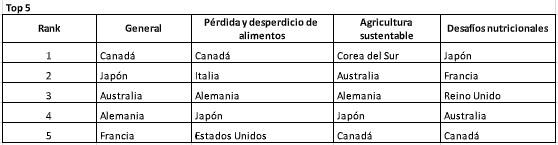 En este sentido los países mejores evaluados fueron Canadá, Italia, Alemania, Japón y Estados Unidos (del 1 al 5 en ese orden). Aunque los niveles de pérdida y desperdicio de alimentos medidos varían, los cinco países demuestran, en general, una fuerte respuesta política a este problema, en especial por que cuentan con legislaciones nacionales enfocados a reducir esta situación, contrario a países como Indonesia y México que lograron malos resultados, ya que alcanzan altos grados de pérdida y desperdicio, y aunque abordan la problemática en cierta medida, hay pocas pruebas de que existan políticas para enfrentar esta cuestión.