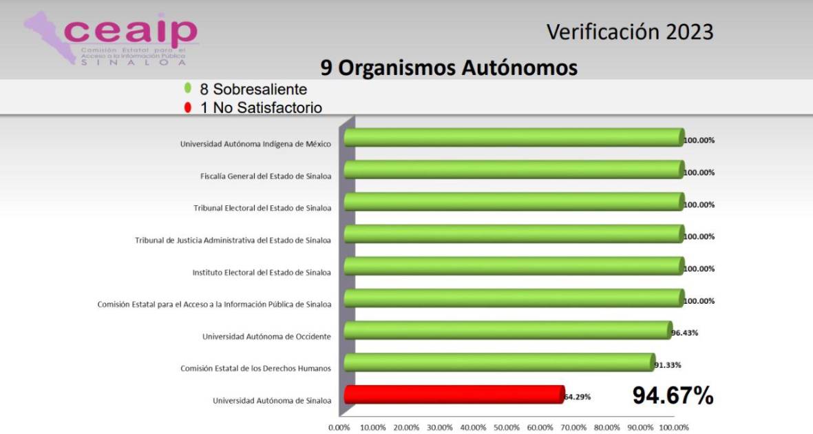 Los otros entes autónomos son la Comisión Estatal de los Derechos Humanos con 91.33 por ciento de cumplimiento; Universidad Autónoma de Occidente al 96.43 por ciento; y seis con 100 por ciento: Instituto Electoral del Estado de Sinaloa, Fiscalía General del Estado, Universidad Autónoma Indígena de México, Tribunal Electoral del Estado de Sinaloa, Tribunal de Justicia Administrativa y la propia CEAIP.