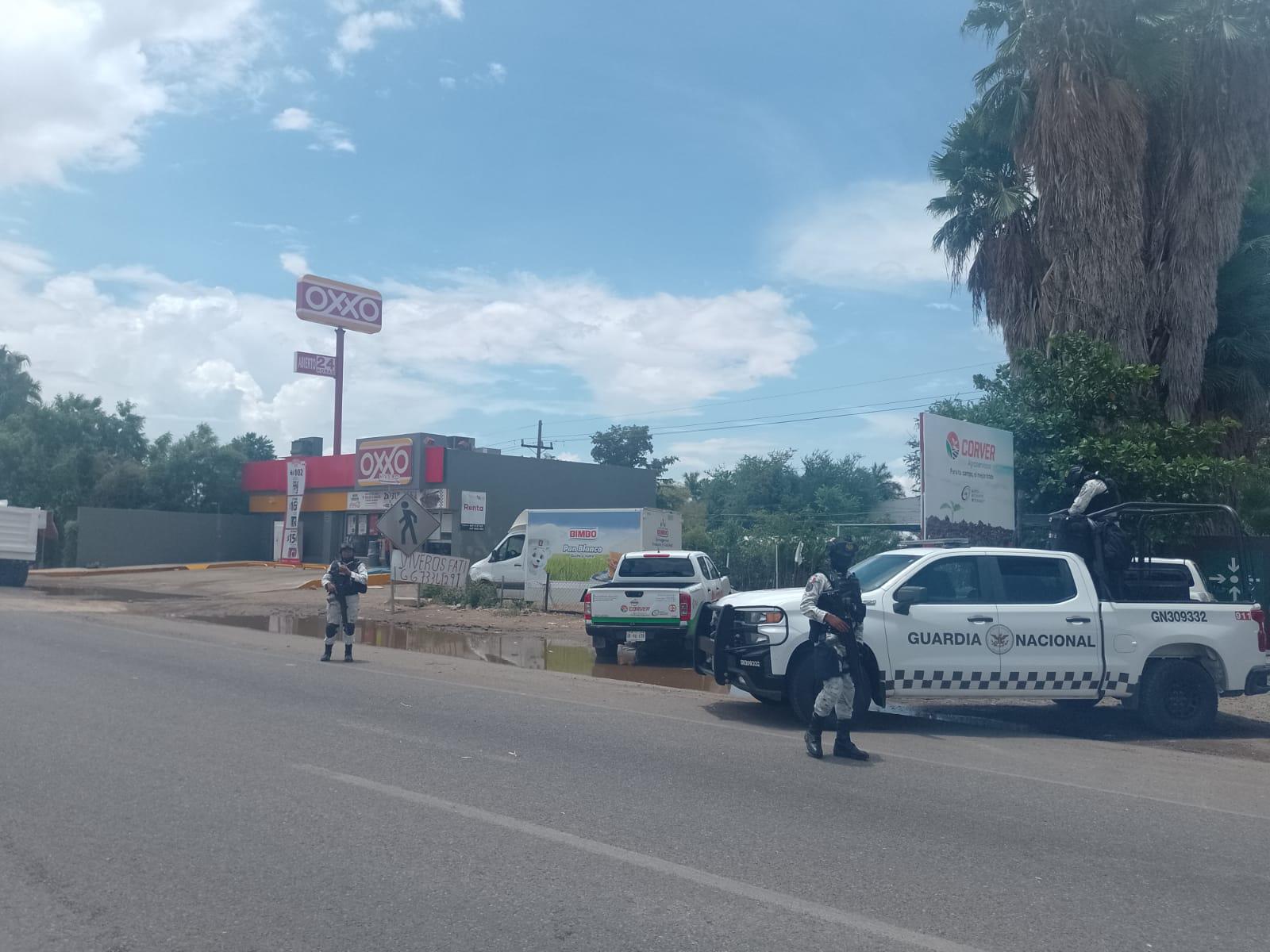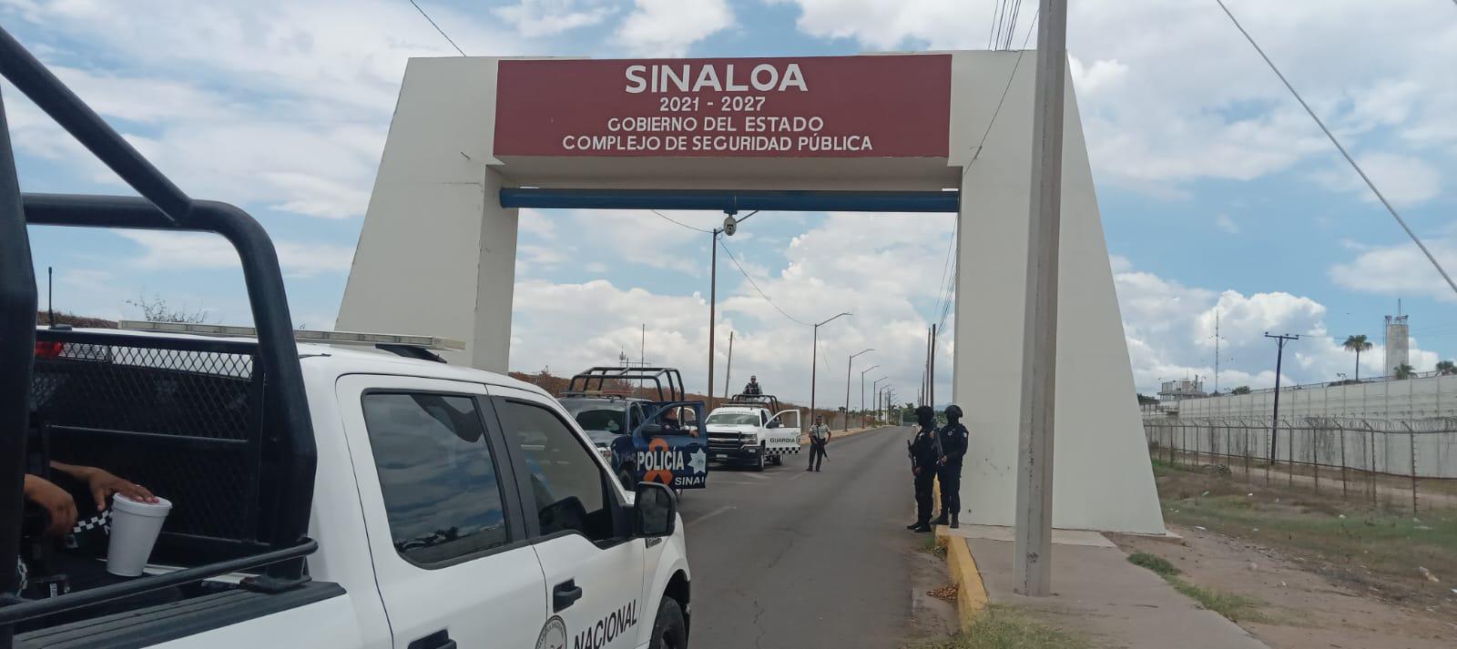 Elementos de la Guardia Nacional y Policía Estatal resguardan las afueras de las instalaciones del Complejo de Seguridad Pública ubicado a un costado de la carretera Culiacán-Navolato, esto luego de un operativo desplegado por la Secretaría de Seguridad Pública durante la mañana de este martes en la sindicatura El Tamarindo.