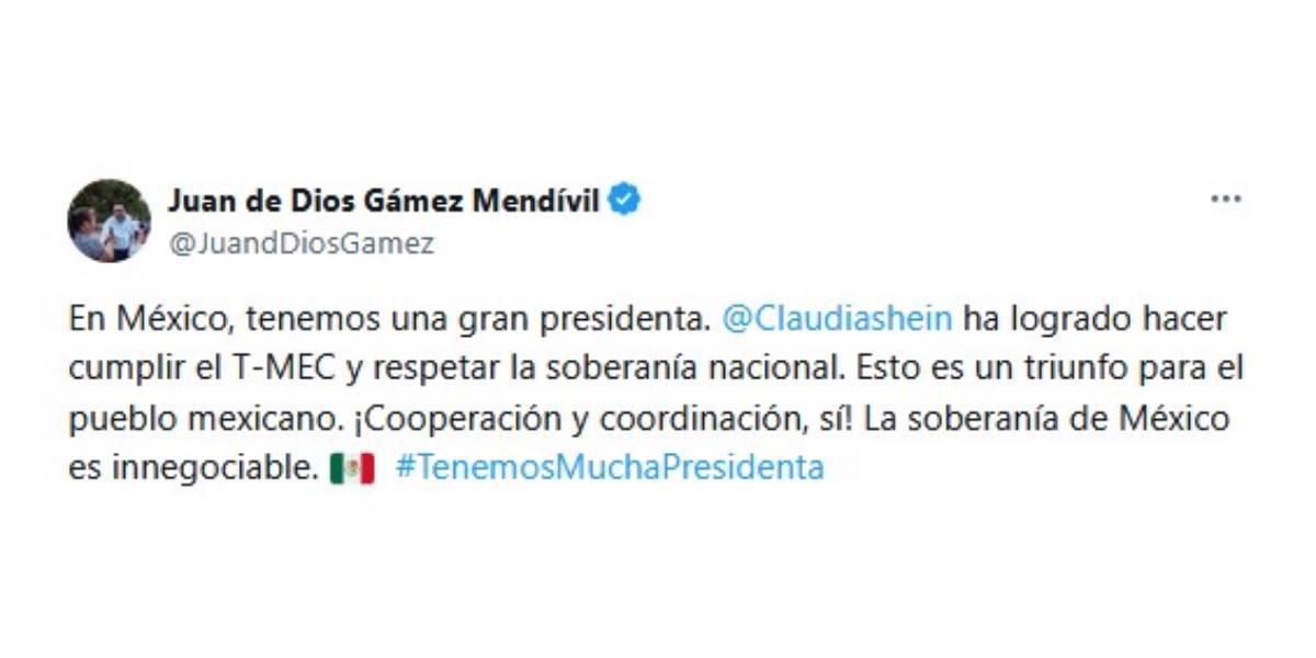 ”En México, tenemos una gran Presidenta. @Claudiashein ha logrado hacer cumplir el T-MEC y respetar la soberanía nacional. Esto es un triunfo para el pueblo mexicano. ¡Cooperación y coordinación, sí! La soberanía de México es innegociable. #TenemosMuchaPresidenta”, compartió en X.