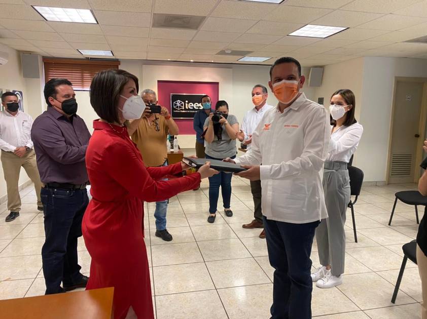 Respaldado por un centenar de militantes, con banderas blancas y naranjas, Sergio Torres Félix llegó a registrarse al Instituto Electoral del Estado de Sinaloa como candidato a la Gubernatura por el partido Movimiento Ciudadano.