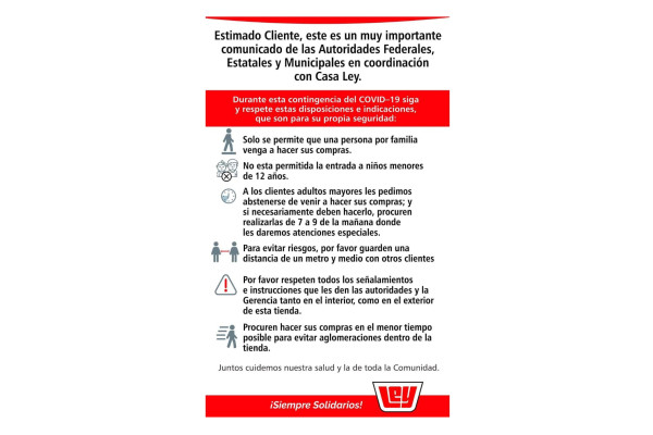 Atendiendo las indicaciones de autoridades sanitarias y de seguridad, Ley limitará el acceso a sus tiendas a solamente una persona por familia al realizar las compras.