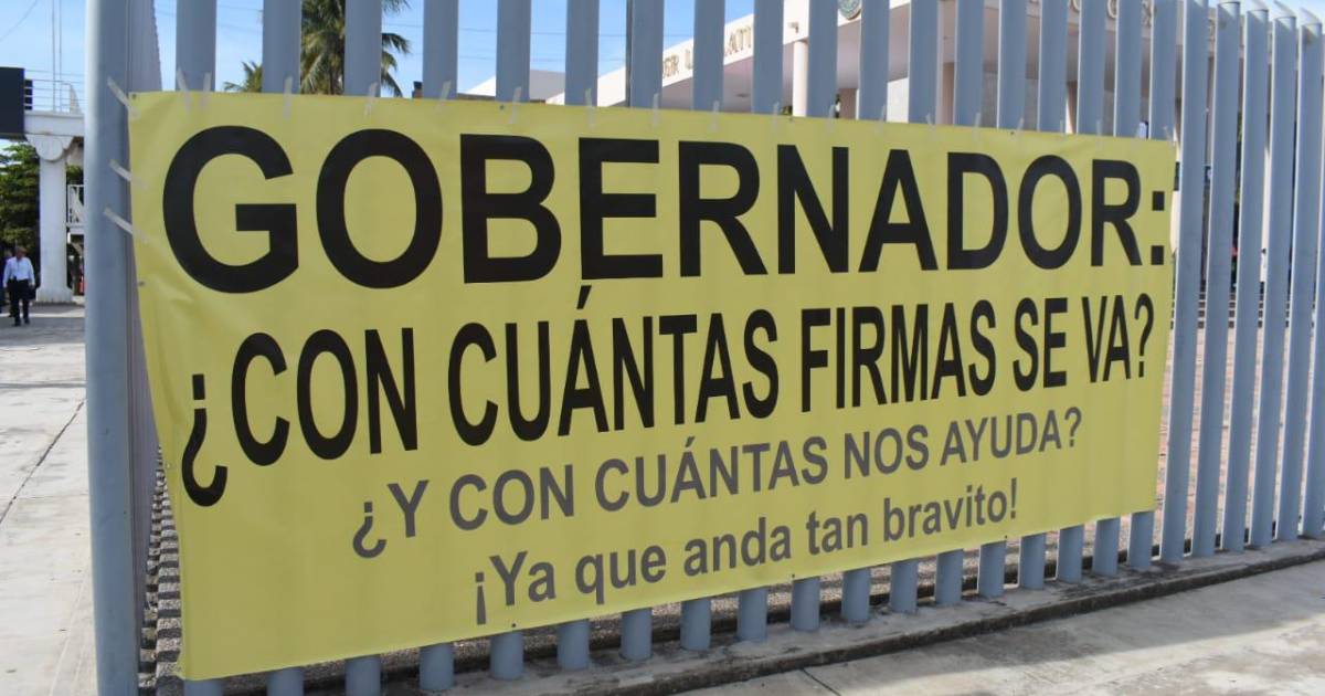 En la entrada del Palacio Legislativo colocaron cinco mantas en las que colocan ‘Gobernador: ¿Con cuántas firmas se va? ¿Y con cuántas nos ayuda?’, así como ‘Diputados: ¡BASTA YA! ¡EXIGIMOS SEGURIDAD! Están para servir al pueblo, no al Gobernador’.