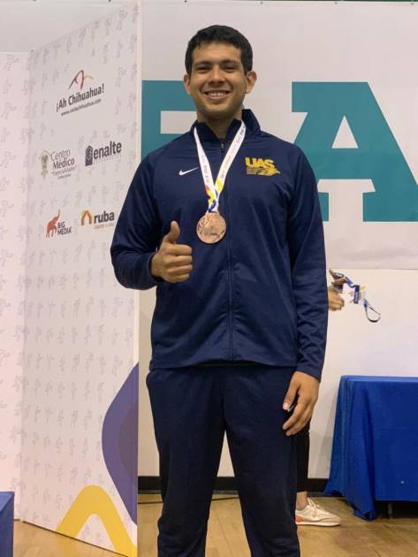 El estudiante de primer año de Ingeniería Bioquímica de la UAS, ganó 4 combates en la división menos de 54 kilos para colgarse la medalla de oro, el último, frente al IPN y lo ganó 12 a 10.