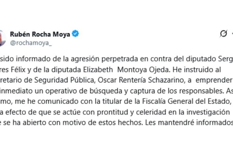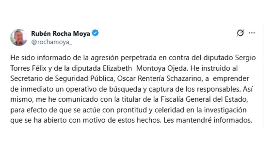 El Gobernador Rubén Rocha Moya confirmó el ataque armado contra los diputados locales de Movimiento Ciudadano, Sergio Torres Félix y Elizabeth Rafaela Montoya Ojeda, ambos heridos por arma de fuego en el centro de Culiacán.