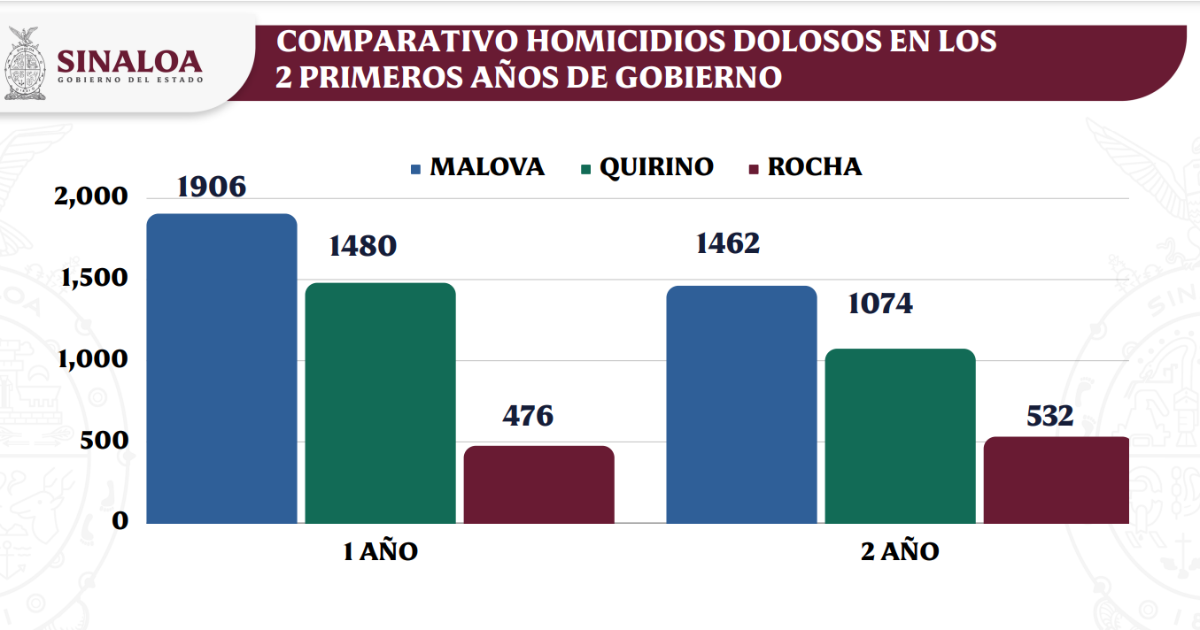 También se comparó el periodo de Quirino Ordaz Coppel, que en el primer año de administración tuvo mil 480 homicidios y en el segundo año mil 074 casos.