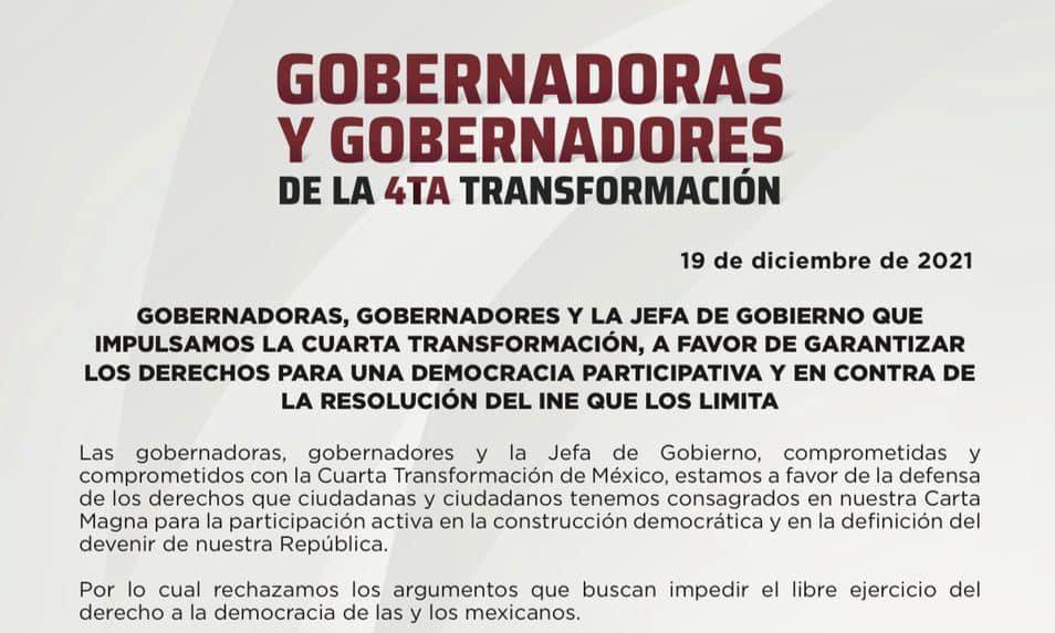 El Instituto Nacional Electoral limita la participación de la ciudadanía en la democracia, así lo consideraron gobernadores, gobernadoras y la Jefa de Gobierno de la CDMX, todos de Morena, al posicionarse en rechazo a la decisión de este órgano sobre la consulta de revocación de mandato, postura respaldada por el Gobernador Rubén Rocha Moya, incluido como uno de los firmantes.