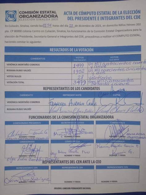 La ex Diputada Roxana Rubio Valdez se autodeclaró ganadora de la votación interna del PAN Sinaloa para la renovación del comité directivo estatal, sin embargo, la comisión organizadora de la elección no ha emitido resultado oficial.