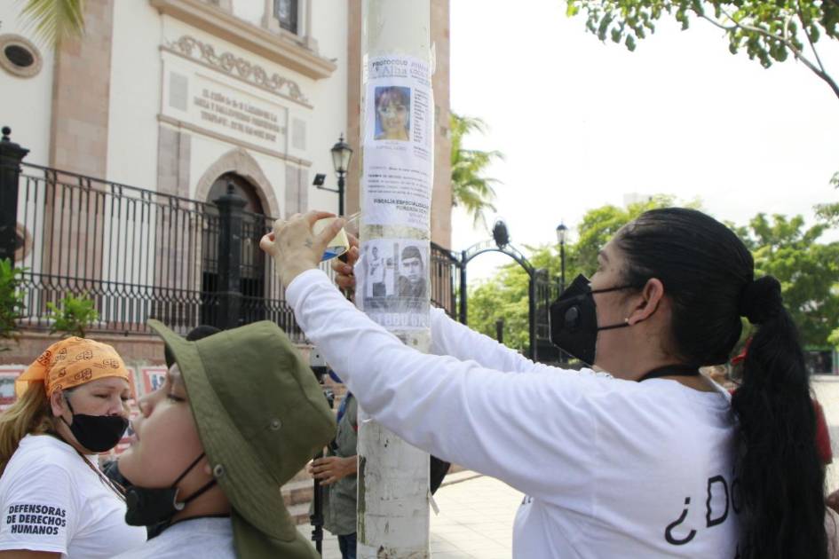 Sabuesos Guerreras tapizan el Centro de Culiacán con rostros de sus desaparecidos