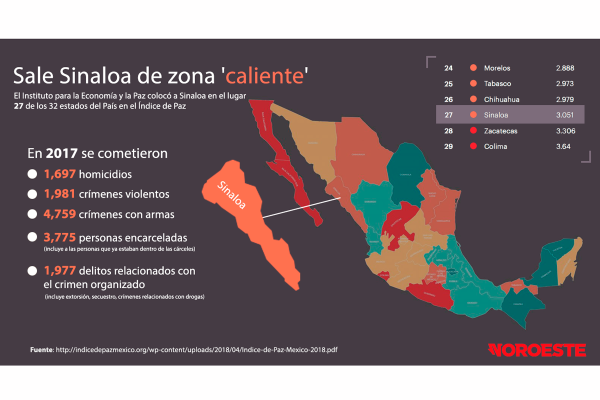 De acuerdo con el Índice, en 2016 el Estado fue la tercera entidad menos pacífica del País, detrás de Guerrero y Colima, pero un año más tarde el reporte estableció que Baja California Sur, Baja California y Zacatecas incrementaron sus índices de violencia, superando de forma proporcional a Sinaloa.