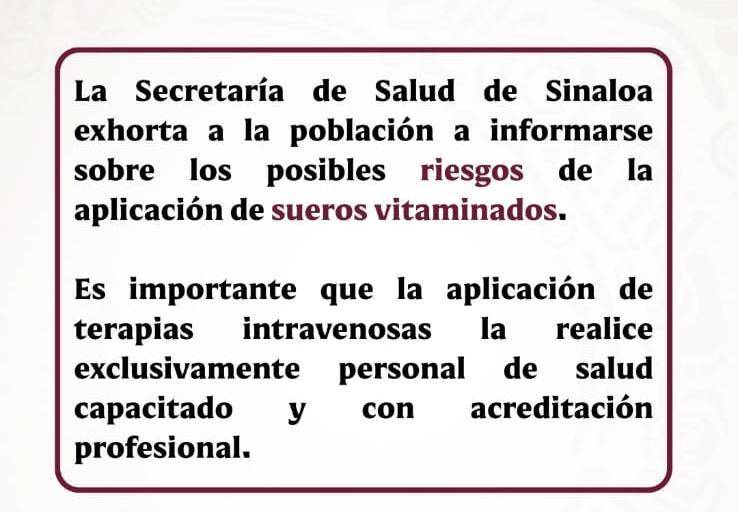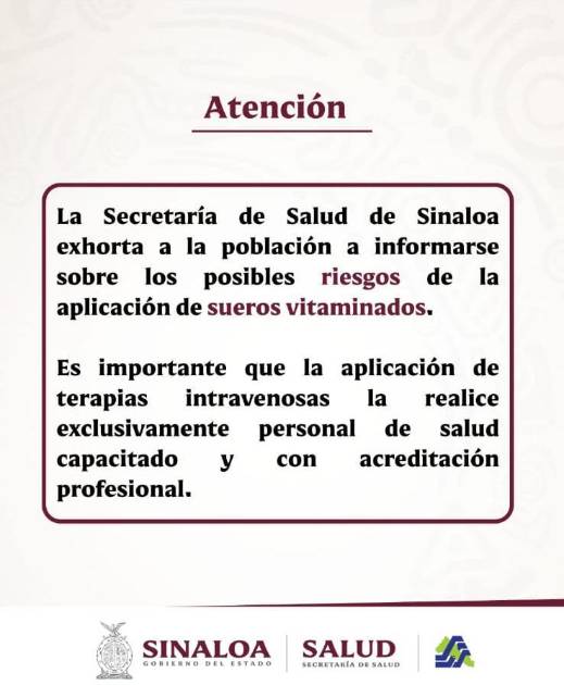 La Secretaría de Salud de Sinaloa emitió un exhorto a la población para informarse sobre los posibles riesgos asociados a la aplicación de sueros vitaminados, al advertir que este tipo de terapias intravenosas deben realizarse únicamente bajo supervisión de personal médico capacitado y con acreditación profesional.