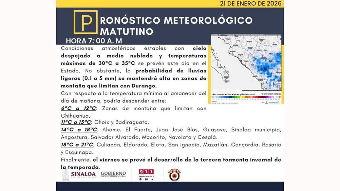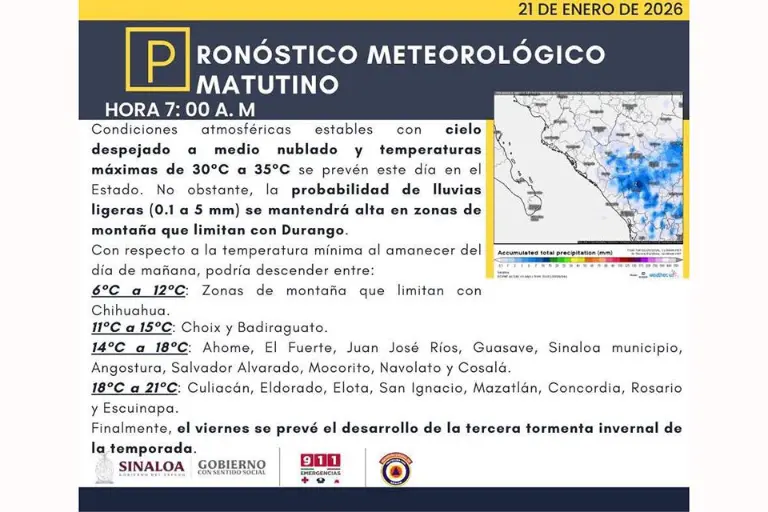 El ambiente fresco a templado por las mañanas seguirá predominando en la región del Pacífico Norte, pero con el avance del sistema invernal, se recomienda a la población, especialmente en los municipios de Choix y Badiraguato, donde se esperan mínimas de 11 a 15 grados, tomar precauciones ante el cambio brusco de temperatura que se consolidará hacia el fin de semana.