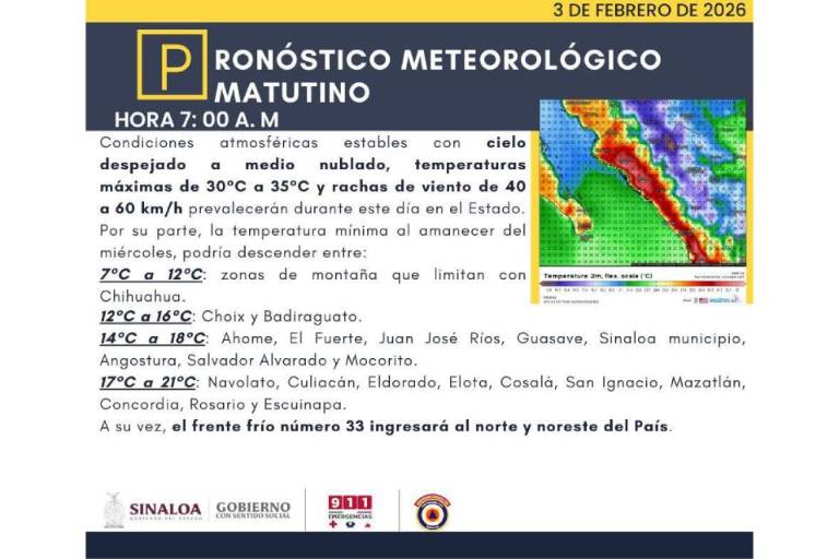 En la franja norte, que abarca Ahome, El Fuerte, Juan José Ríos, Guasave, Sinaloa municipio, Angostura, Salvador Alvarado y Mocorito, las mañanas oscilarán entre los 14 y 18 grados.