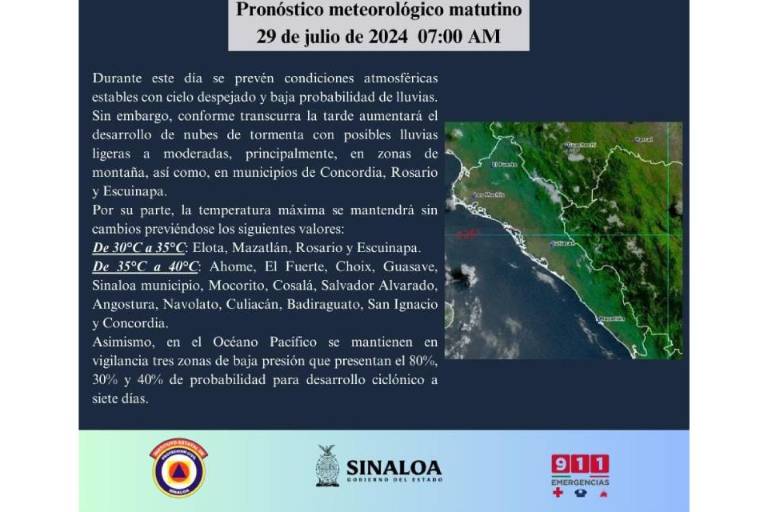 Para este día en Sinaloa, se prevén lluvias ligeras a moderadas en zonas de montaña y municipios del sur como Concordia, Rosario y Escuinapa, también habrá temperaturas que alcanzarán los 40 grados y viento de oeste a suroeste de 15 a 30 kilómetros por hora.