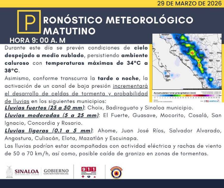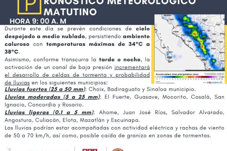 El alcance de este canal de baja presión se extenderá con lluvias moderadas de 5 a 25 milímetros hacia El Fuerte, Guasave, Mocorito, Cosalá, San Ignacio, Concordia y Rosario.