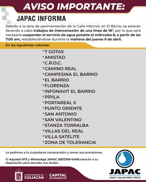 Para cualquier duda o reporte, la Japac recordó a la ciudadanía que están disponibles la línea de Aquatel 073 y el número de WhatsApp 6671000406.