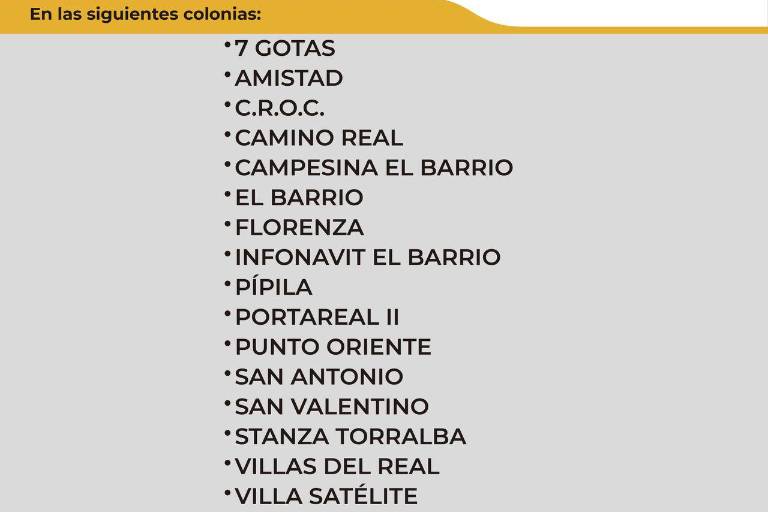 7 Gotas, Amistad, Croc, Camino Real, Campesina El Barrio, El Barrio, Florenza, Infonavit El Barrio, Pípila, Portareal, Punto Oriente, San Antonio, San Valentino, Stanza Torralba, Villas del Real, Villa Satélite.
