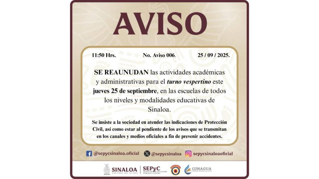 La Secretaría de Educación Pública y Cultura dio a conocer que este jueves 25 de septiembre se reanudan las actividades académicas y administrativas en el turno vespertino en las escuelas de todos los niveles y modalidades educativas en Sinaloa.