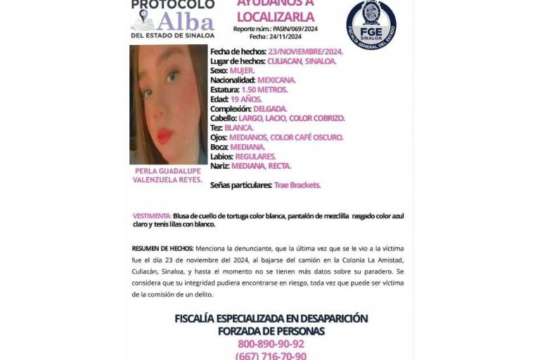 Perla, de 19 años, se encuentra desaparecida después de que bajó de un camión urbano en Culiacán la tarde del sábado.