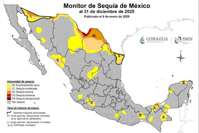 De acuerdo con el Monitor de Sequía de México, al 31 de diciembre de 2025, siete municipios de Sinaloa presentaban sequía moderada, lo que representa el 20.4 por ciento del territorio estatal; mientras que tres municipios, equivalentes al 23.4 por ciento, registraban condiciones anormalmente secas.