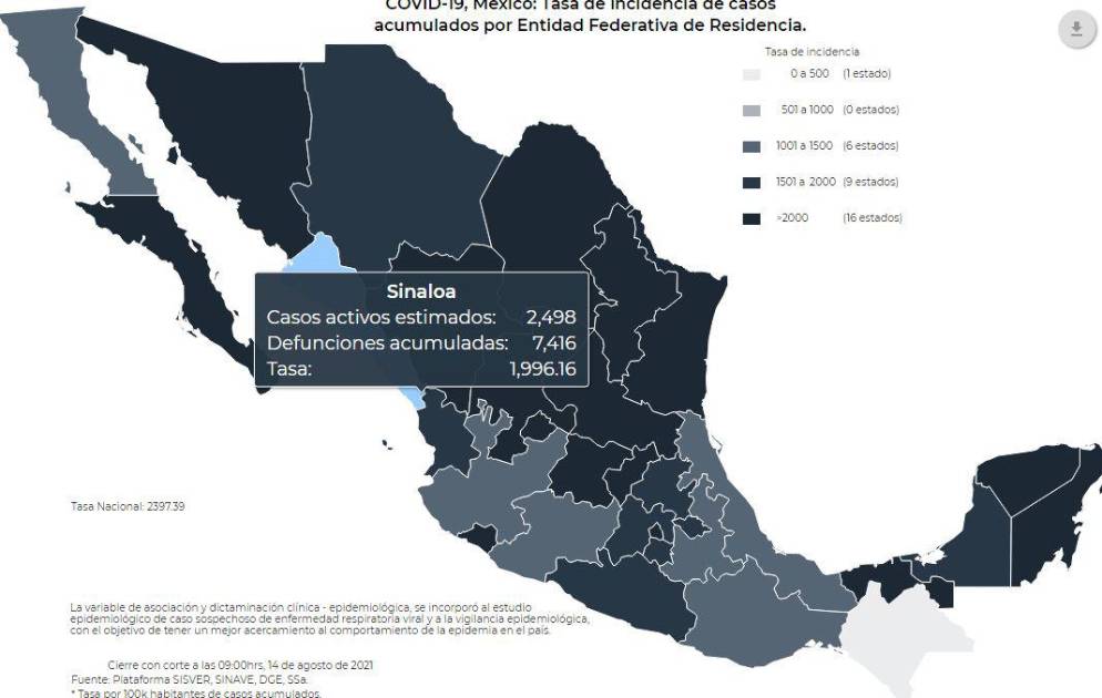Sinaloa acumula 7 mil 400 decesos y tiene 2 mil 634 casos activos simultáneos de Covid: Salud