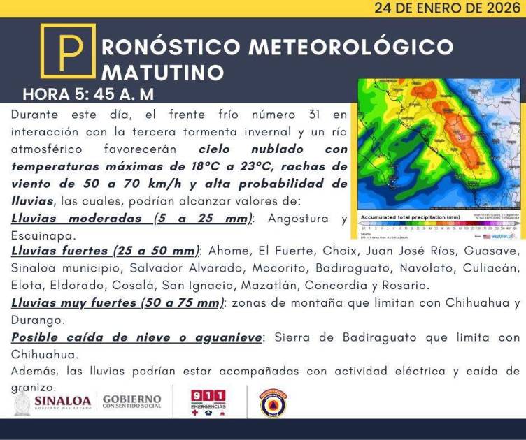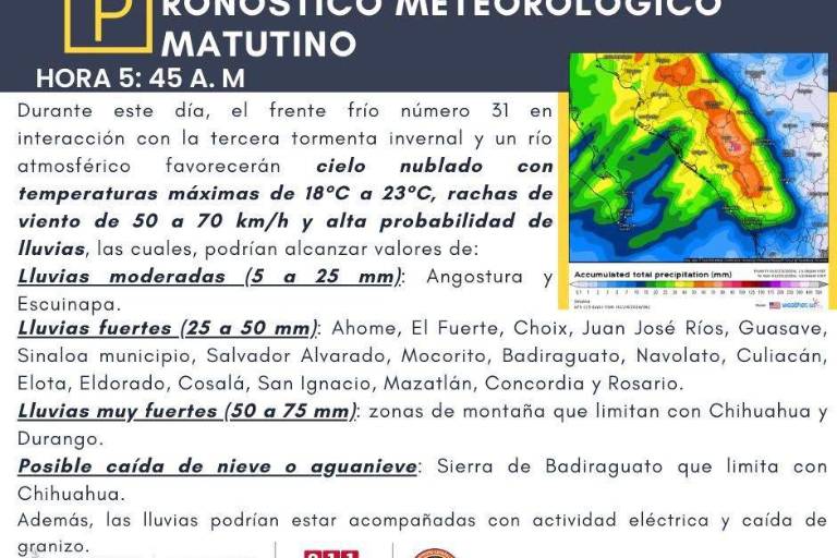 En las zonas altas y el norte del estado se ha emitido una alerta por la posible caída de nieve o aguanieve en la sierra de Badiraguato, específicamente en los límites con Chihuahua y en cuanto a las precipitaciones, el panorama estatal es de lluvias muy fuertes de 50 a 75 milímetros principalmente en zonas de montaña que colindan con Chihuahua y Durango.