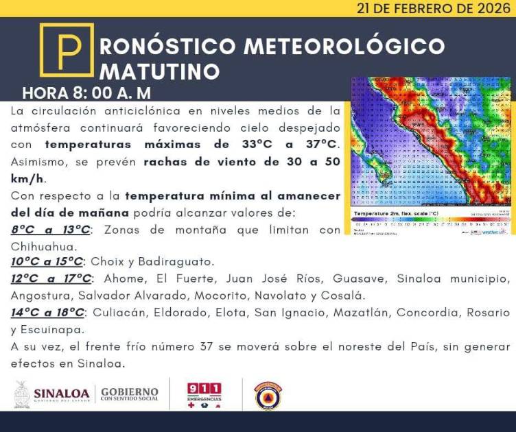Aunque actualmente el frente frío número 37 se desplaza por el noreste de México, los reportes indican que este sistema no generará efectos en Sinaloa y la presencia del anticiclón actúa como una barrera que impide el descenso drástico de las temperaturas en el centro y sur del estado, favoreciendo además rachas de viento de entre 30 y 50 kilómetros por hora en diversas zonas.