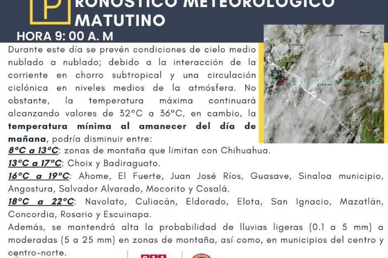 Por su parte, municipios como Choix y Badiraguato esperan registros entre los 13 y 17 grados; mientras que en la zona norte y centro-norte, que incluye a Ahome, El Fuerte, Juan José Ríos, Guasave, Sinaloa municipio, Angostura, Salvador Alvarado, Mocorito y Cosalá, las mínimas rondarán los 16 a 19 grados.