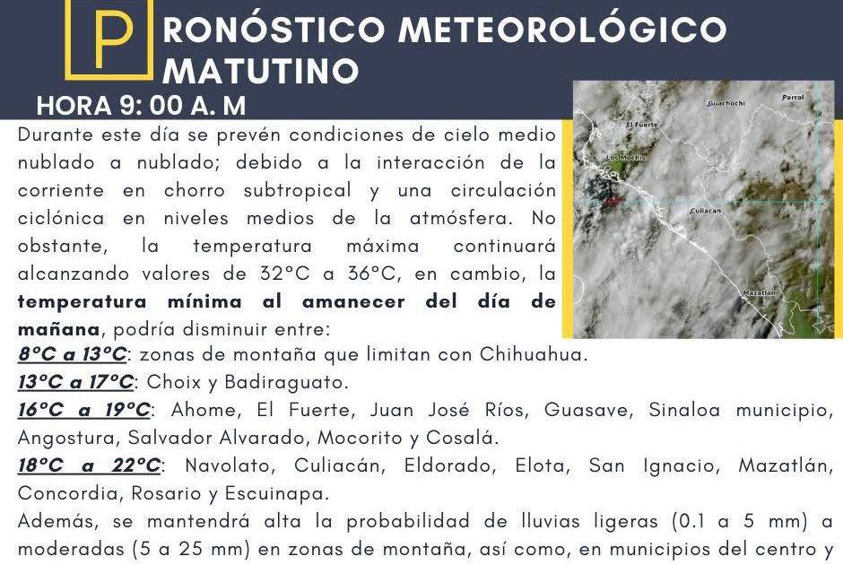 El reporte matutino de Protección Civil advierte que, mientras en la costa y el centro el calor aún persiste, las zonas de la sierra que limitan con Chihuahua tendrán las temperaturas más bajas del estado, con mínimas que descenderán hasta los 8 y 13 grados al amanecer de este lunes.