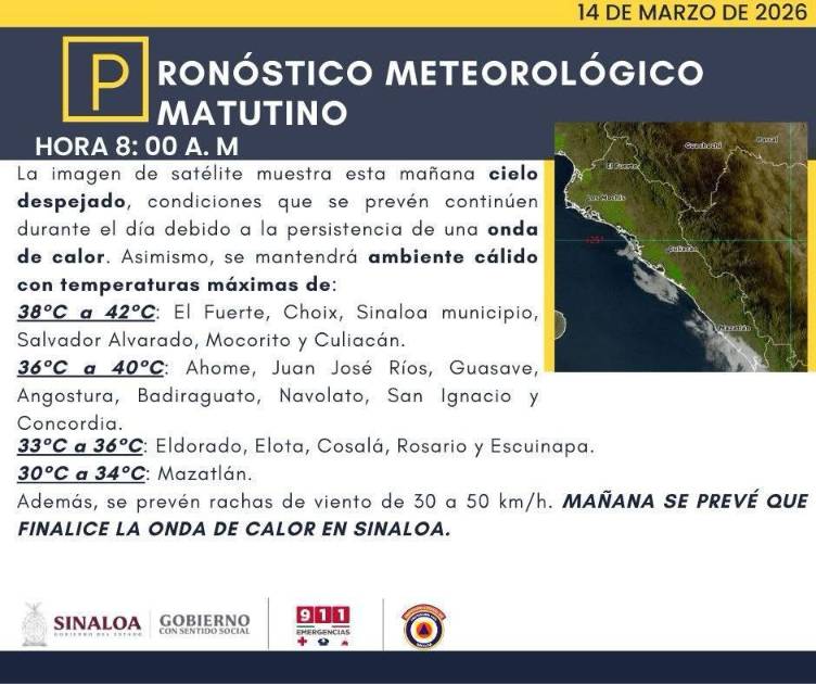 La persistencia de una onda de calor sobre el noroeste del país mantiene a Sinaloa bajo condiciones de temperaturas extremas este 14 de marzo, afectando principalmente a los municipios del norte y centro del estado, donde el termómetro llegará a los 42 grados centígrados.