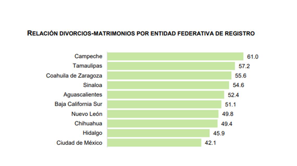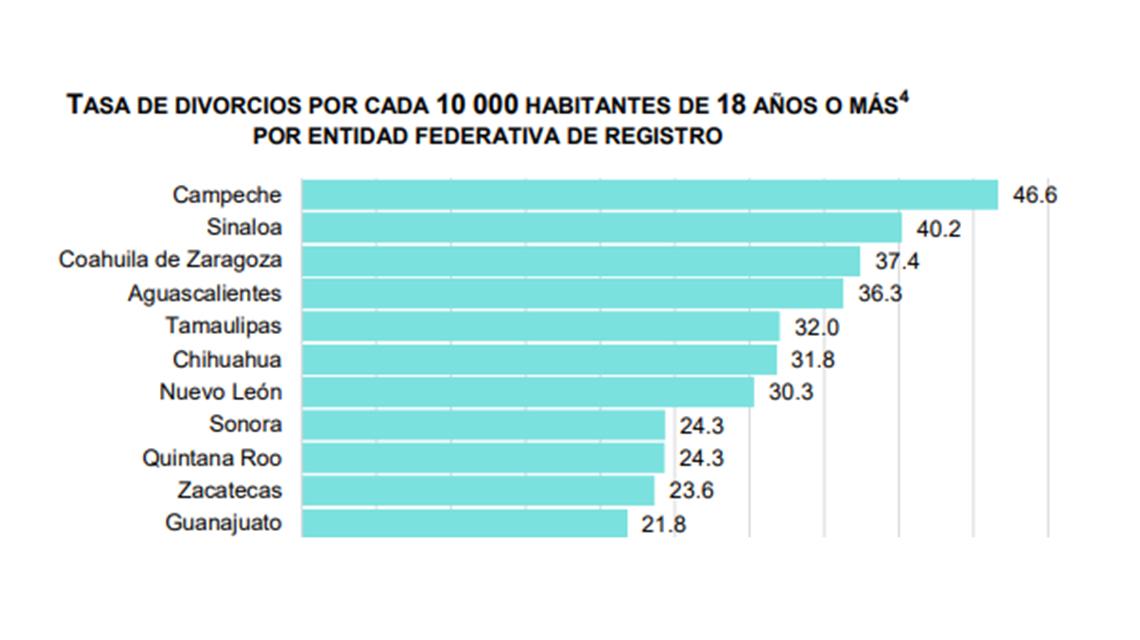 En 2021, las entidades con las mayores tasas de divorcios por cada 10 mil habitantes de 18 años o más fueron: Campeche, con 46.6; Sinaloa, con 40.2 y Coahuila de Zaragoza con 37.4. Las menores tasas correspondieron a Veracruz de Ignacio de la Llave, con 6.4, Oaxaca con 8.6 y Puebla con 9.1.