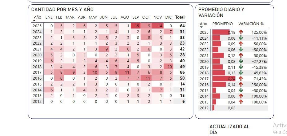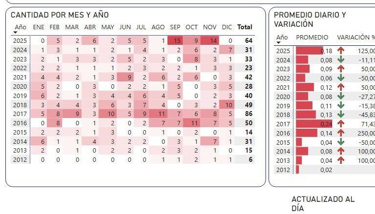 Desde 2018 y hasta 2024, los conteos anuales habían fluctuado entre 23 y 40 casos, sin alcanzar niveles similares a los de 2025.