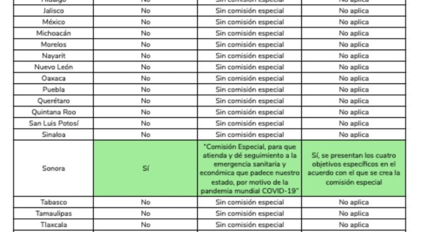 “Aunque en materia de la emergencia sanitaria han comparecido funcionarios federales y estatales ante el congreso federal y locales, tras 100 días de la declaratoria de emergencia, sólo dos Congresos locales, el de Sonora y el de Coahuila, han creado comisiones especiales de seguimiento específico a temas relacionados con el COVID-19”, dice el reporte.