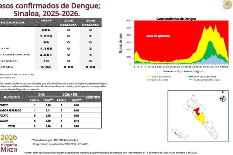 Sinaloa comenzó el año 2026 con cuatro casos confirmados de dengue, además de 74 probables, lo que coloca a la entidad como la segunda con mayor incidencia de la enfermedad en el País durante la primera semana del año.