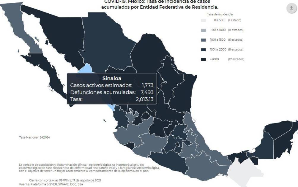 En las cifras que la dependencia actualiza diariamente, boletinó que Sinaloa tiene mil 955 pacientes simultáneos a nivel estatal. Este 17 de agosto fueron confirmados 347 nuevos infectados de coronavirus, 89 de ellos en Culiacán, 83 en Ahome, 80 en Mazatlán, 27 en Escuinapa, 12 en Cosalá, Guasave, Elota y Navolato sumaron nueve más cada uno.