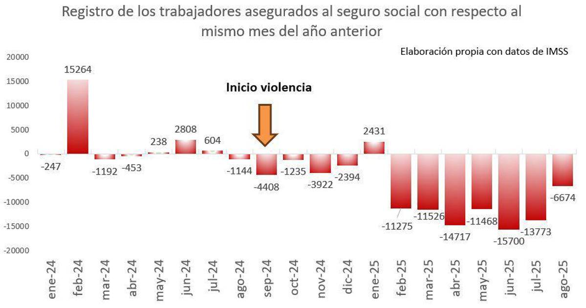 Los datos del IMSS muestran que, desde septiembre de 2024, cuando inició la crisis de violencia en Sinaloa, el empleo formal empezó a caer de manera sostenida.