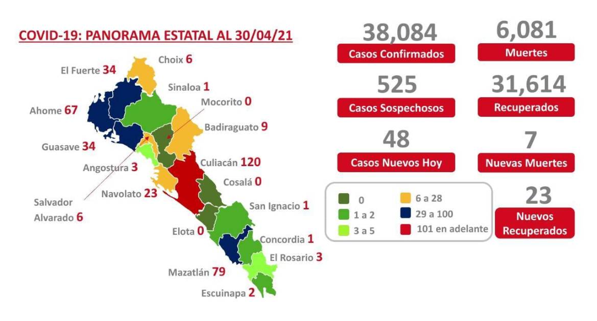 En total existen 389 casos activos de las cuales Culiacán tiene 120, Mazatlán tiene 79 y Ahome 67 entre los 3 principales, los municipios de Cosalá, Mocorito y Elota registran cero casos.