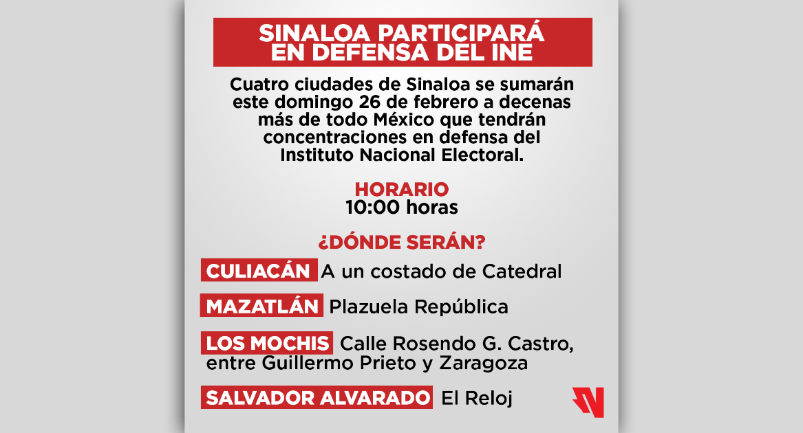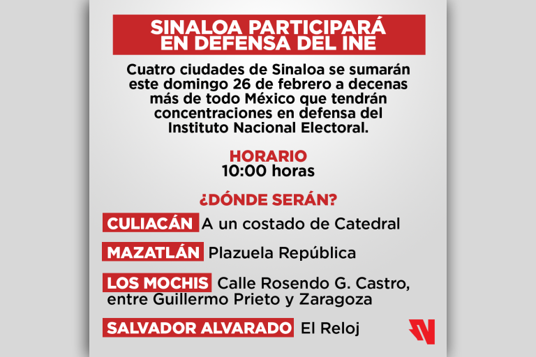 Este domingo 26 de febrero en cuatro ciudades de Sinaloa habrá concentraciones cívicas en defensa del Instituto Nacional Electoral, sumándose a las decenas en todo México.