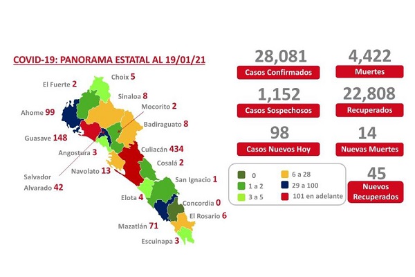 Sinaloa rebasó los 28 mil infectados históricos de Covid-19, informó la Secretaría de Salud estatal. Este martes fueron confirmados 98 contagios más, sumando 28 mil 081 contagios históricos contabilidados desde el 28 de febrero del 2020 al 19 de enero del 2021.