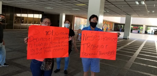 En la pancarta que lleva Maribel puede leerse "Necesitamos de trabajo para comer". El cubrebocas que promete protegerle de contagiarse de coronavirus cambia de lugar conforme ella va alzando la voz, como abriendo paso a las consignas que emanan de sus labios.