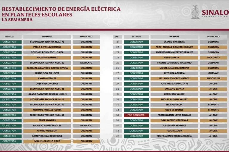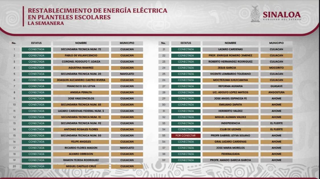 En Sinaloa, después de más de un mes que escuelas públicas se mantuvieron sin energía eléctrica debido a contratos con la Comisión Federal de Electricidad, ya sólo falta una escuela en ser reconectada de 39 que se mantenían sin luz.