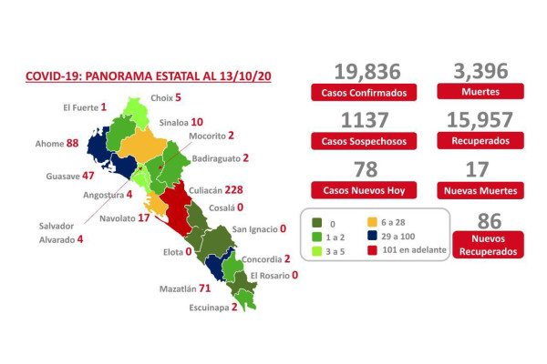 La Secretaría de Salud estatal registró 78 nuevos casos positivos de Covid-19 en Sinaloa, sumando 19 mil 836 desde el 28 de febrero al 13 de octubre; 40 de los nuevos pacientes son originarios de Culiacán, 12 de Mazatlán, 12 de Ahome, cuatro de Guasave, tres de Navolato, dos de Salvador Alvarado, dos de Sinaloa, Badiraguato, Mocorito y Angostura informaron uno cada uno.