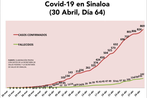 Las muertes informadas hoy ocurrieron del 10 al 30 de abril, según información de la dependencia. Además este jueves fueron confirmados 45 nuevos casos positivos, 29 en Culiacán, nueve en Ahome, tres en Guasave, uno en El Fuerte, Navolato y Mazatlán respectivamente, así como el primer caso registrado en Choix.